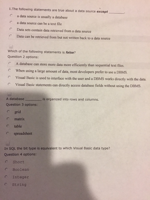 Each data type has a range of values. Which of the following statements are they most likely to agree with when the environment is uncertain? Consider the following data set from the employees table along with its structure and answer the questions 12, 13 and 14 21.what among the following is true about the update statement? Most people think that advantages are much greater. Which of the following statements is true for the data sets. It is not possible to edit searches using advanced search. What of the following statements is correct regarding access. A.limited data sets contain some individual identifiers. If you drag and drop data from a chart or a quick chart into thomson reuters eikon excel the data will automatically update in the spreadsheet. They are an excellent way to help with the problem of the graffiti in many of our cities. If memory or disk space is limited, pca allows you to save space in exchange for losing a little of the data's information. Mark for review (1) points. Which of the following three statements are true about breakpoint?